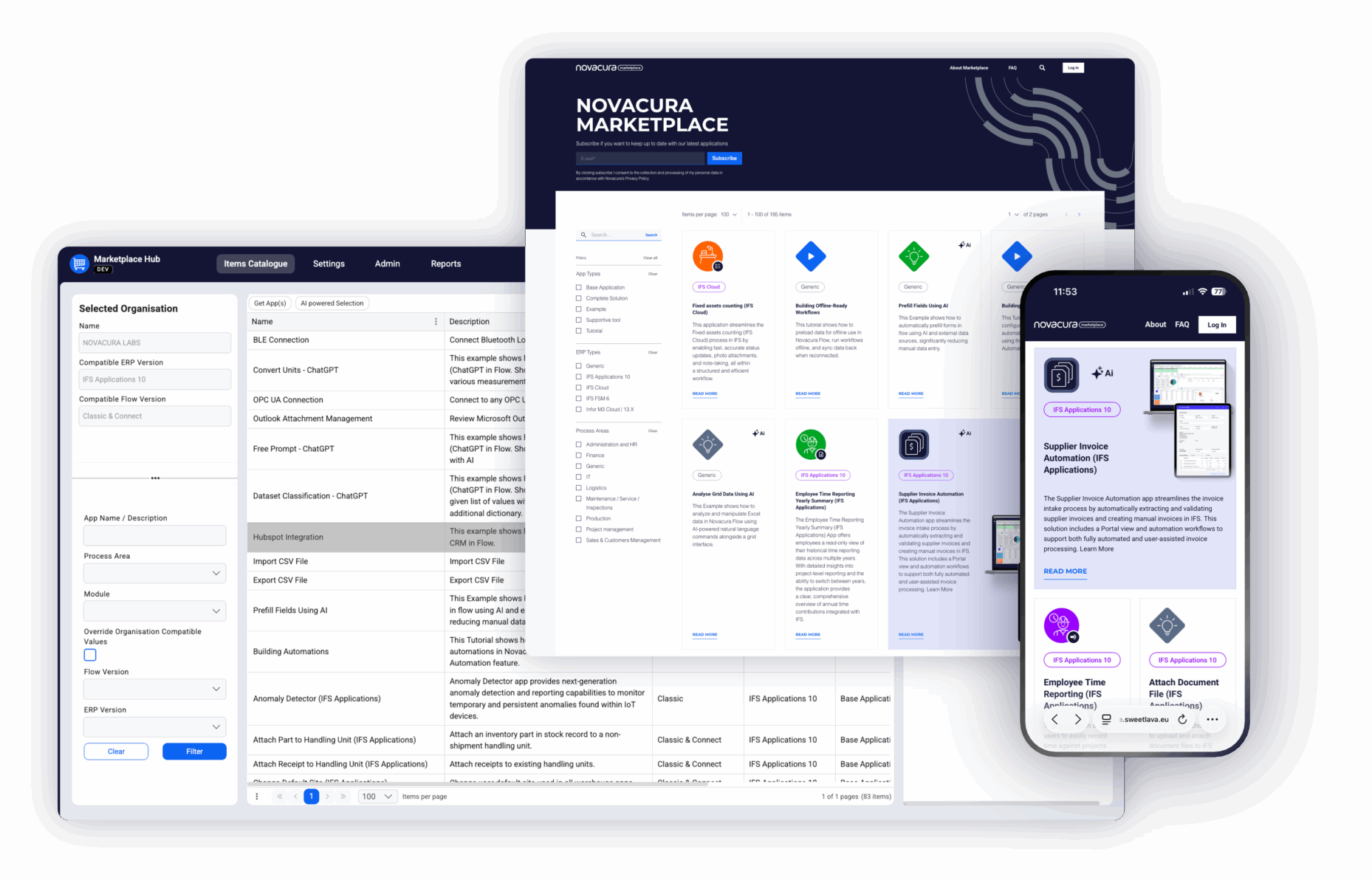 At Novacura, our focus is on providing solutions that integrate innovative technology into your existing ERP framework, ultimately delivering faster time-to-value for your business processes. The Novacura Marketplace is a core part of this approach, serving as a comprehensive source of ready-made applications for your ERP system. Once subscribed, you gain access to the complete library, allowing you to download and import applications directly into your Novacura Flow environment. A key benefit is the flexibility to immediately customize, clone, or build your own individual versions tailored to your specific operational needs. The Marketplace library currently holds 232 applications, ranging from small examples to major solutions. These are categorized to meet varying requirements: Complete Solutions: Complex application sets that can be used “out-of-the-box” for real business processes, such as Warehouse Management Systems (WMS) or Field Service Management. Base Applications: Fully functional applications that deliver one specific, narrow function, such as picking an inventory item. Examples, Tutorials, and Components: Simplified apps or workflow fragments designed to demonstrate specific use-cases, new capabilities, or repeatable activities. In 2025, we delivered 36 new applications (as of November). Our priorities for the year included ensuring the migration of all Flow Classic apps to Flow Connect , expanding Flow’s utility into administrative areas like Procurement and Master Data Management , and developing new applications powered by AI services. For Novacura Marketplace: 2025 App Releases Summary, go to the link and download the free PDF. Practical Examples and Tutorials for Immediate Utility To support Novacura Flow developers and users, the Marketplace contains a substantial section dedicated to practical Examples and Tutorials. These resources focus on core functions and complex integrations. For immediate utility, there are basic examples demonstrating repetitive operations, such as how to import a CSV file into Flow, convert it to a dataset, and display it in a grid, or how to export a Flow dataset to a CSV file. A dedicated Flow Script Module is also available as a component to decode long GS1 barcodes into separate fields for processing. When it comes to integration, the HubSpot CRM Integration Example illustrates how to seamlessly connect HubSpot with an ERP system using Novacura Flow. This enables the automatic synchronization of new customer data from HubSpot to the ERP, eliminating manual data entry. Furthermore, we provide a set of examples that clarify how to correctly access documents and media files via the IFS API, covering both IFS Cloud and IFS Applications 10 environments. Tutorials, in particular, are designed to demonstrate the latest platform capabilities delivered in recent product releases. Driving Efficiency with AI-Powered Apps One of key areas of development has been AI-powered applications, driven by the goal of equipping Flow developers with the capabilities necessary to streamline daily work for end-users. We have developed examples that demonstrate basic AI interactions and practical use for data cleaning and manipulation. For instance, the Convert Units Example utilizes the power of AI to normalize non-unified source data, such as converting a list of mixed length units into a single standard (meters). The Dataset Classification Example showcases how AI can automatically classify records by assigning appropriate dictionary values based on a list of samples. Beyond basic data […]