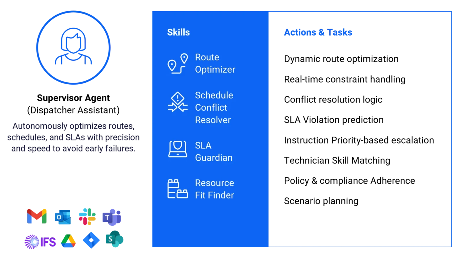 - Integration Layer: Facilitates communication via connectors and actions, enabling agents to leverage IFS data and interact with third-party agents.
