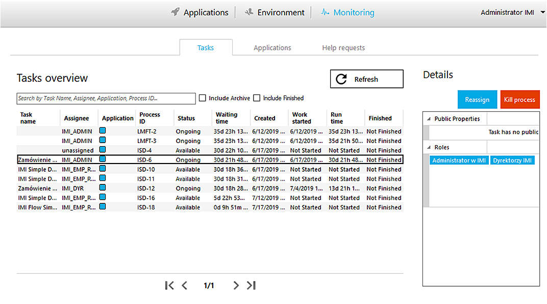 Without any additional configurations (log points), Novacura Flow monitors all process instances that run controlled by the Novacura Flow Server. You can see the overall process performance time. You can also check which processes are waiting in particular inboxes for someone´s reaction. In cases where the assignee is unavailable or delayed with his tasks, an administrator can reassign the task to someone else.